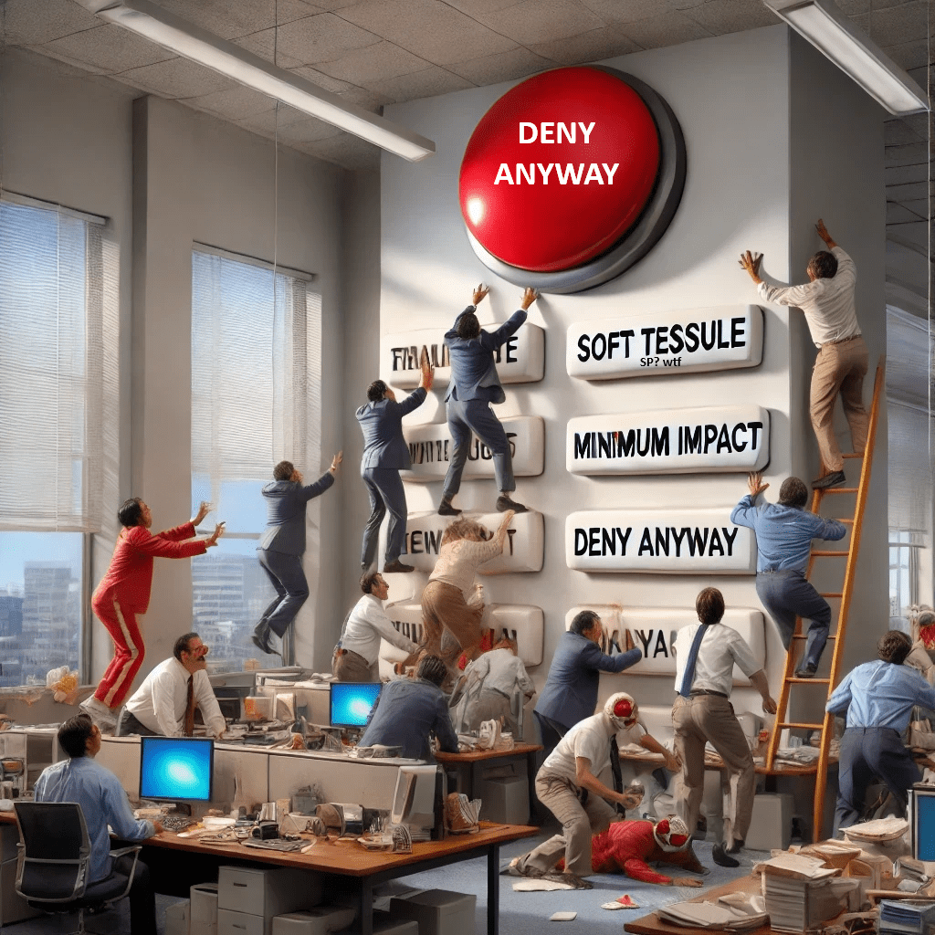Can The Insurance Company Deny My Claim By Saying “Soft Tissue” Or “Minimum Impact” Perhaps. Some minimal offers have the same effect. This is the functional denial. Some insurance adjusters may use “soft tissue” as a way to downplay the seriousness of an injury. Unlike fractures or visible wounds, soft tissue injuries don’t always show up on X-rays and can be more subjective, which makes them easier for insurers to dispute. They often argue that: